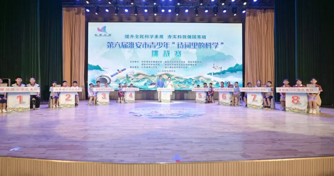 啟動(dòng)儀式現(xiàn)場(chǎng),還舉行了第六屆淮安市青少年“詩(shī)詞里的科學(xué)”挑戰(zhàn)賽。此次賽事歷經(jīng)網(wǎng)絡(luò)選拔,從全市118所學(xué)校、2.3萬(wàn)余名選手中,選拔出中小學(xué)各8支代表隊(duì),進(jìn)行最后的角逐。賽事分為“有問(wèn)必答”“快速搶答”“飛花令”三個(gè)環(huán)節(jié),層層遞進(jìn)考驗(yàn)選手的“詩(shī)詞積累”與“科學(xué)認(rèn)知”。