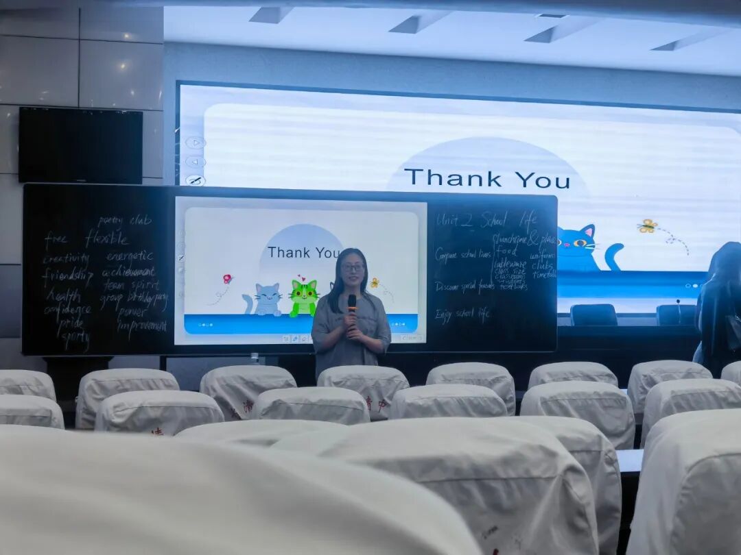 在五樓學術(shù)報告廳,初中英語組的朱麗娟老師為老師們帶來了一節(jié)《8A Unit 2 School life Integration A-C》的展示課。朱老師引入數(shù)字人美國交換生Toby這一虛擬角色,以其對中國校園生活的探索欲為線索開啟課堂。教學采用任務驅(qū)動法,圍繞“中美校園生活對比與感受本校特色”設(shè)計“信息輸入(看、讀、聽)—語言輸出(說、寫)”的梯度任務鏈,在中美教育文化對比中,培養(yǎng)學生跨文化意識與批判性思維。同時引導學生以英語為載體,小組合作展現(xiàn)本校校園特色,實現(xiàn)了語言綜合能力與核心素養(yǎng)的雙重提升,有效達成了數(shù)智融合促進深度學習的課堂目標。