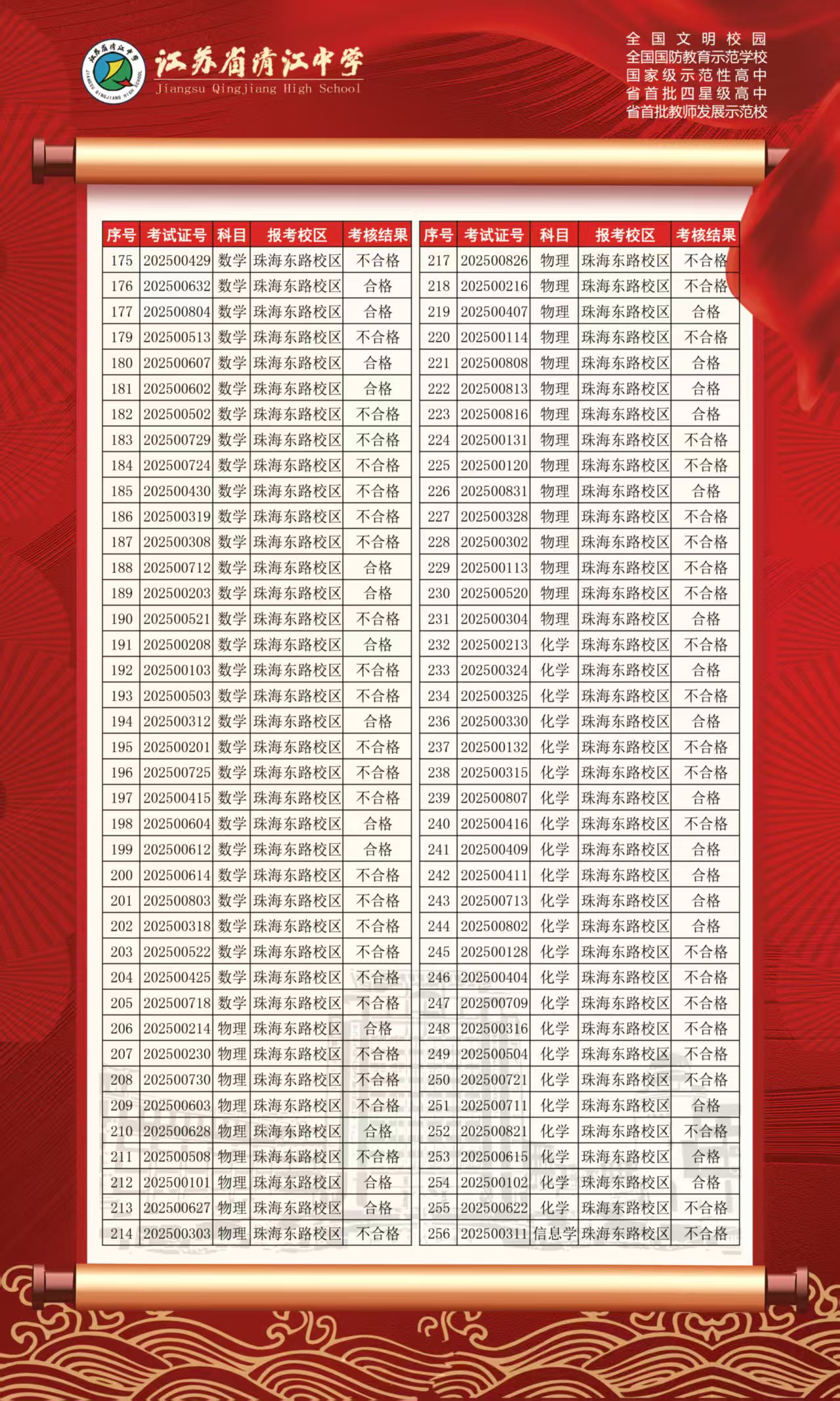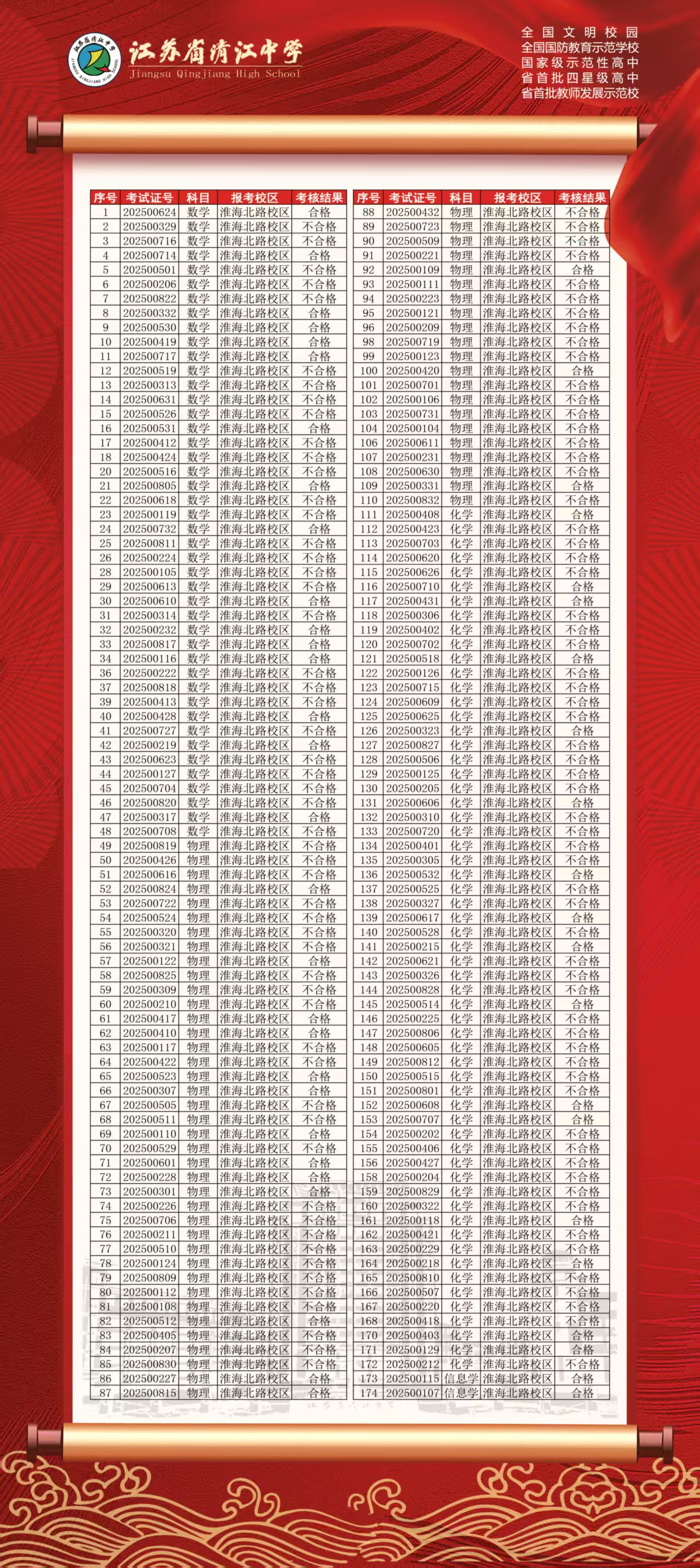 根據(jù)《淮安市招委會(huì)關(guān)于2025年中等學(xué)校招生工作意見(jiàn)》和《江蘇省清江中學(xué)自主招收2025級(jí)高一特長(zhǎng)生實(shí)施辦法》,經(jīng)考生自主報(bào)名,學(xué)校組織審核評(píng)議和學(xué)科能力測(cè)試,考核結(jié)果,現(xiàn)予公示。如有情況反映,請(qǐng)于6月26日下午5:30前與校紀(jì)委聯(lián)系,聯(lián)系電話:83902127。