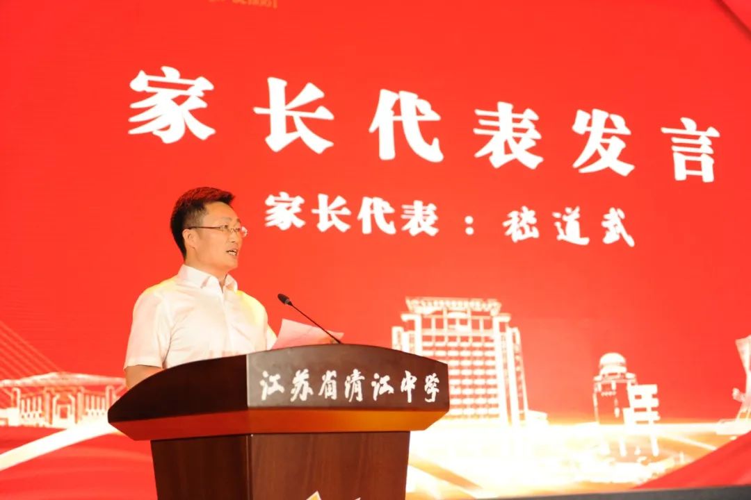 高三(20)班嵇鳴軒同學爸爸嵇道武作為家長代表登臺發(fā)言。他為孩子的成長感到驕傲,并向辛勤培育孩子們的全體老師致以最誠摯的謝意。他深情祝愿同學們在未來的日子里,永葆赤子之心,秉持感恩之心,錘煉堅韌之心,書寫屬于自己的精彩人生!