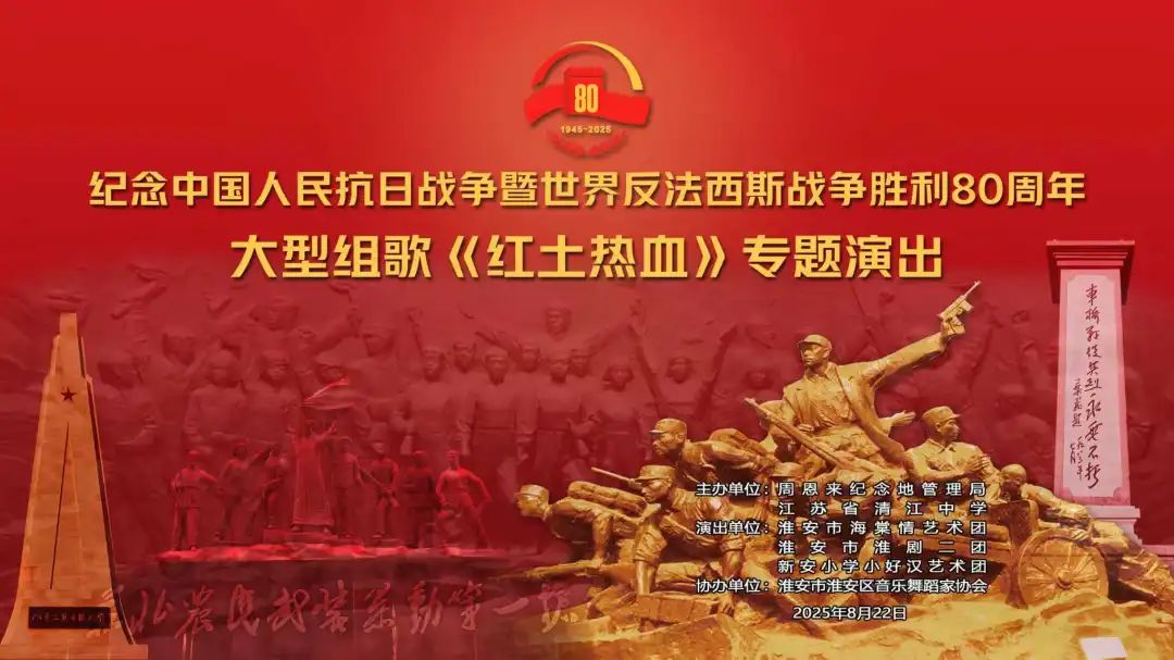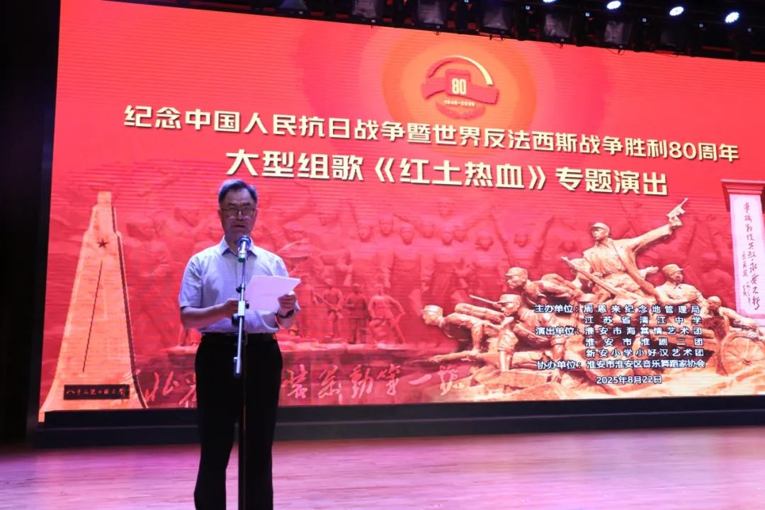 為紀(jì)念中國(guó)人民抗日戰(zhàn)爭(zhēng)暨世界反法西斯戰(zhàn)爭(zhēng)勝利80周年,8月22日上午,大型組歌“紅土熱血”專(zhuān)題演出在省清江中學(xué)千人報(bào)告廳隆重上演。本次演出由周恩來(lái)紀(jì)念地管理局與江蘇省清江中學(xué)聯(lián)合主辦,淮安市海棠情藝術(shù)團(tuán)、淮安市淮劇二團(tuán)、新安小學(xué)小好漢藝術(shù)團(tuán)攜手獻(xiàn)藝,淮安市淮安區(qū)音樂(lè)舞蹈家協(xié)會(huì)協(xié)辦,以藝術(shù)之名回望歷史、致敬時(shí)代,傳承先輩用熱血與信念鑄就的精神豐碑。