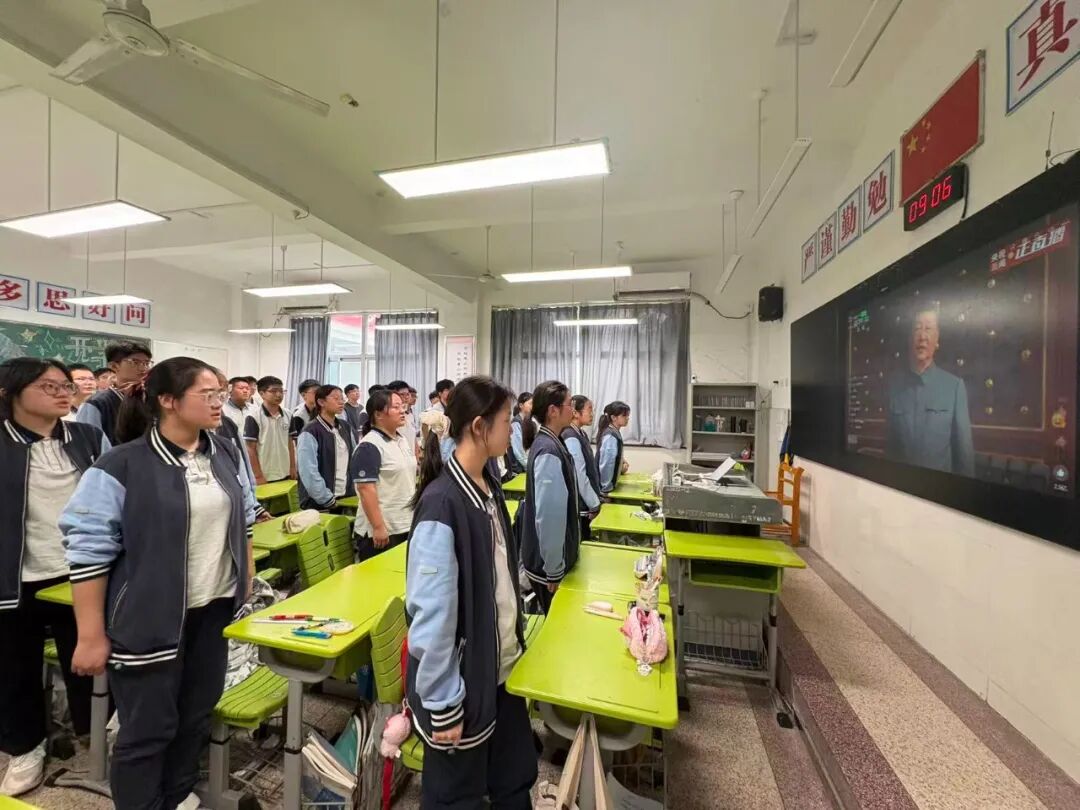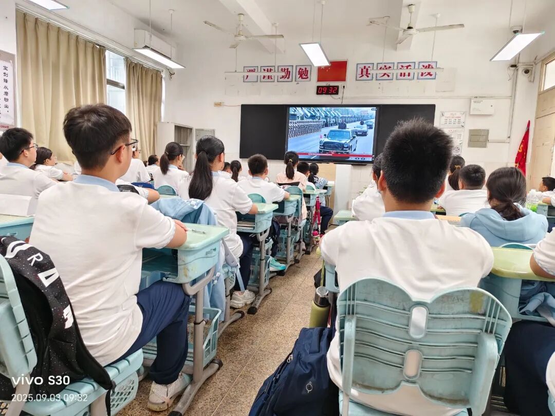 學(xué)校對(duì)此次活動(dòng)高度重視,進(jìn)行了周密的部署。各班班主任隨班陪同觀看,確保活動(dòng)有序進(jìn)行。報(bào)告廳和學(xué)生劇場(chǎng)內(nèi),巨大的電子屏幕清晰直播著閱兵盛況,場(chǎng)面莊嚴(yán)肅穆;教室里,同學(xué)們通過(guò)多媒體設(shè)備同樣感受到現(xiàn)場(chǎng)震撼人心的氛圍。