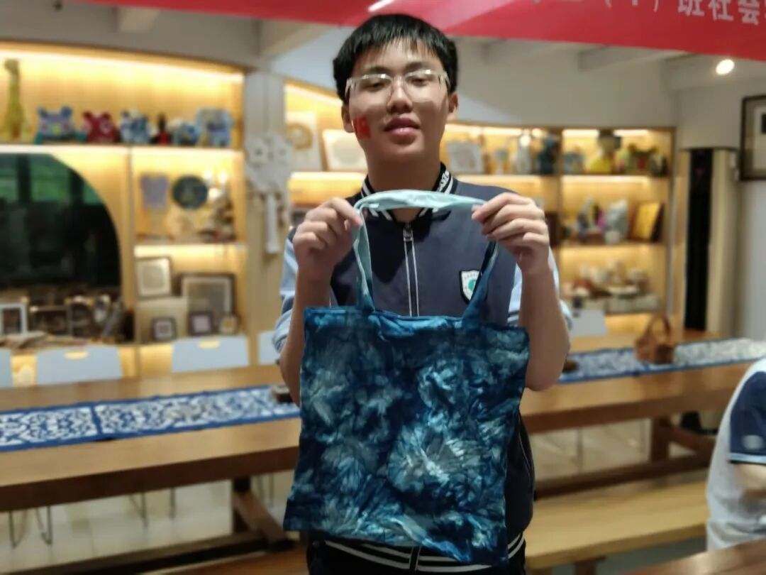 張業(yè)謙同學說:“今天親手體驗了扎染,真的太神奇了!一折一疊,皮筋一扎,浸入染缸,展開的瞬間,美麗的藍色花紋像在布上綻放。我完全被古人的智慧震撼了——他們怎么想到用如此簡單的方法創(chuàng)造出這么美的圖案!”