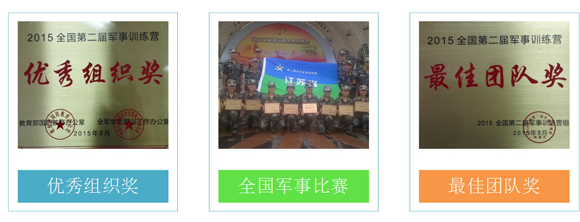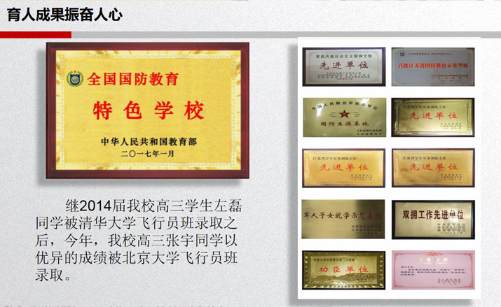 在2015年第二屆全國大中學(xué)生軍事訓(xùn)練營比賽中,由我校國防班同學(xué)參加的江蘇代表隊(duì)榮獲團(tuán)體總分第二名。在2017年第四屆全國大中學(xué)生軍事訓(xùn)練營比賽中,由我校國防班同學(xué)參加的江蘇代表隊(duì)榮獲團(tuán)體總分第一名。在2017年首屆全國中學(xué)生軍事五項(xiàng)比賽中,由我校國防班同學(xué)組成的江蘇代表隊(duì)榮獲一等獎第一名。在2018年第五屆全國學(xué)生軍事訓(xùn)練營活動中,我校國防班6名同學(xué)參與的核生化防護(hù)、電子頻譜管控比賽中榮獲團(tuán)體一等獎。國防班學(xué)生在全國各類軍事競賽中取得的優(yōu)異成績,提升了學(xué)校的知名度與美譽(yù)度。學(xué)校榮獲首批“全國國防教育示范學(xué)校”和“全國國防教育特色學(xué)校”。