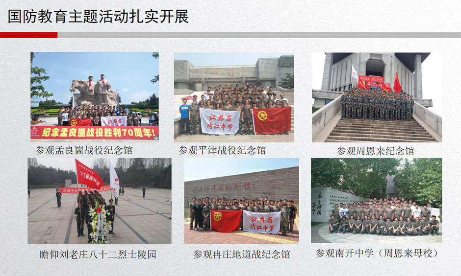 學(xué)校在國防班學(xué)科教學(xué)中滲透國防教育理念,積極探索將國防教育進(jìn)課表、進(jìn)教案、進(jìn)課堂“三進(jìn)”融入文化學(xué)科教學(xué)模式。學(xué)校編寫了《軍政訓(xùn)練課程》、《國防講座課程》、《革命傳統(tǒng)詩詞》、《紅色資源》、《革命小故事》、《軍歌嘹亮》等國防班系列校本教材,并在國防班學(xué)生中投入使用。組織國防班學(xué)生開展“六個一”主題教育活動,即每年參觀一個革命圣地、每學(xué)期選讀一本軍事書籍、每月撰寫一篇思想?yún)R報(bào)、觀看一部愛國主義影片、每周開展一次主題演講、學(xué)唱一首軍歌。在重要紀(jì)念日,學(xué)校組織國防班學(xué)生赴革命圣地和軍事博物館開展主題教育活動。2017年暑期,在建軍90周年之際,我校組織國防班全體師生赴北京、天津等愛國主義教育基地參觀訪問,追尋偉人足跡,參觀了孟良崮戰(zhàn)役紀(jì)念館、平津戰(zhàn)役紀(jì)念館、冉莊地道戰(zhàn)紀(jì)念館、周恩來鄧穎超紀(jì)念館,參加了天安門廣場的升旗儀式。
