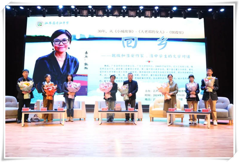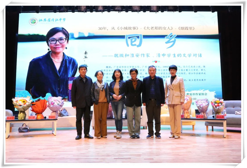 11月10日,江蘇省清江中學(xué)在千人報告廳舉行了以“回鄉(xiāng)”為話題的魏微和淮安作家、清中學(xué)生的文學(xué)對話座談會。本次活動由蔡正鵬副校長主持,人民文學(xué)出版社編輯樊曉哲女士,淮安市作協(xié)主席龔正先生,淮安市作協(xié)顧問劉季女士,江蘇省清江中學(xué)喬中云校長,崔玉老師,清泉文學(xué)社學(xué)生代表趙元皓、唐貞恬兩位同學(xué)及淮安作協(xié)的部分作家、高二全體同學(xué)參加了這次座談會。